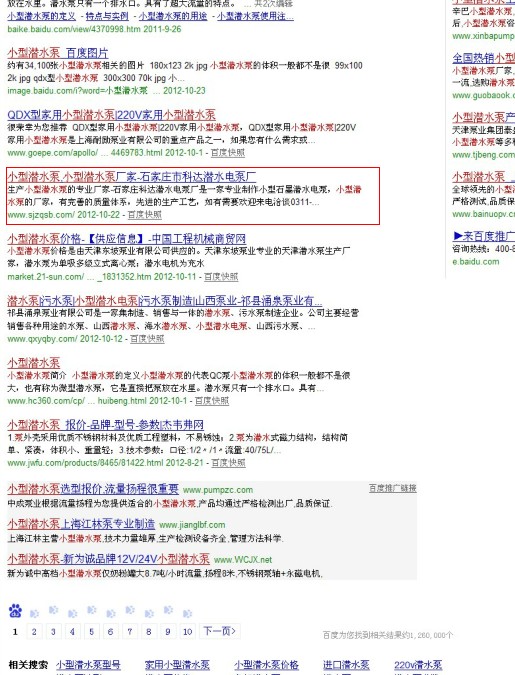 优化关键词:小型潜水泵 优化网站 :www.sjzqsb.com 优化效果 :在百度搜索优化关键词,优化网站出现在搜索结果的首页如下图